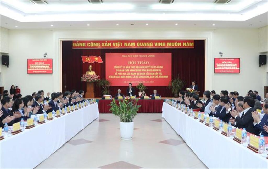 Phát biểu khai mạc Hội thảo, Trưởng ban Dân vận Trung ương Bùi Thị Minh Hoài nhấn mạnh, sau 20 năm thực hiện Nghị quyết số 23 và các chủ trương của Đảng về đại đoàn kết toàn dân tộc, chúng ta đã đạt được nhiều kết quả tích cực, như báo cáo chính trị tại Đại hội Đảng toàn quốc lần thứ XIII: “Sức mạnh đại đoàn kết toàn dân tộc được củng cố; dân chủ xã hội chủ nghĩa tiếp tục được phát huy. Ban hành và thực hiện có hiệu quả nhiều chủ trương, chính sách, pháp luật nhằm tăng cường khối đại đoàn kết toàn dân tộc, phát huy quyền làm chủ của nhân dân. Mặt trận Tổ quốc và các đoàn thể nhân dân tiếp tục đổi mới nội dung và phương thức hoạt động, vận động đông đảo nhân dân tham gia các phong trào thi đua yêu nước, phát huy ngày càng tốt hơn vai trò đại diện quyền và lợi ích hợp pháp, chính đáng của đoàn viên, hội viên và nhân dân; chủ động tham gia giám sát và phản biện xã hội; làm tốt vai trò cầu nối giữa Đảng, Nhà nước và nhân dân; tham gia xây dựng Đảng, Nhà nước và hệ thống chính trị, góp phần tích cực vào những thành tựu chung của đất nước”, để đất nước ta chưa bao giờ có được cơ đồ, tiềm lực, vị thế và uy tín quốc tế như ngày nay.