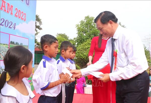 TTXVN - Chiều 15/1, Chủ tịch UBND tỉnh Tiền Giang Nguyễn Văn Vĩnh chủ trì lễ công bố và trao Bằng công nhận xã Cẩm Sơn (huyện Cai Lậy) đạt chuẩn nông thôn mới kiểu mẫu. Dịp này, Chủ tịch UBND tỉnh trao tặng Đảng bộ, nhân dân xã Cẩm Sơn công trình phúc lợi xã hội trị giá 2 tỷ đồng.