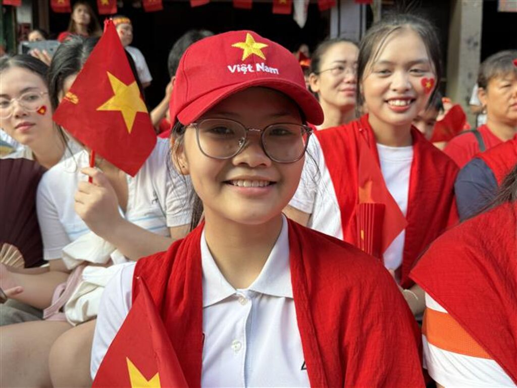 Trong ánh nắng ban mai tươi đẹp của ngày Quốc khánh 2/9, hoà chung không khí náo nhiệt, mừng vui trên phố Nguyễn Thái Học (Hà Nội), bạn Lê Thị Bảo Trâm (Nghệ An) cho biết đã cùng các bạn học của mình di chuyển từ Nghệ An ra Hà Nội từ chiều hôm trước để kịp hoà chung ngày hội non sông.