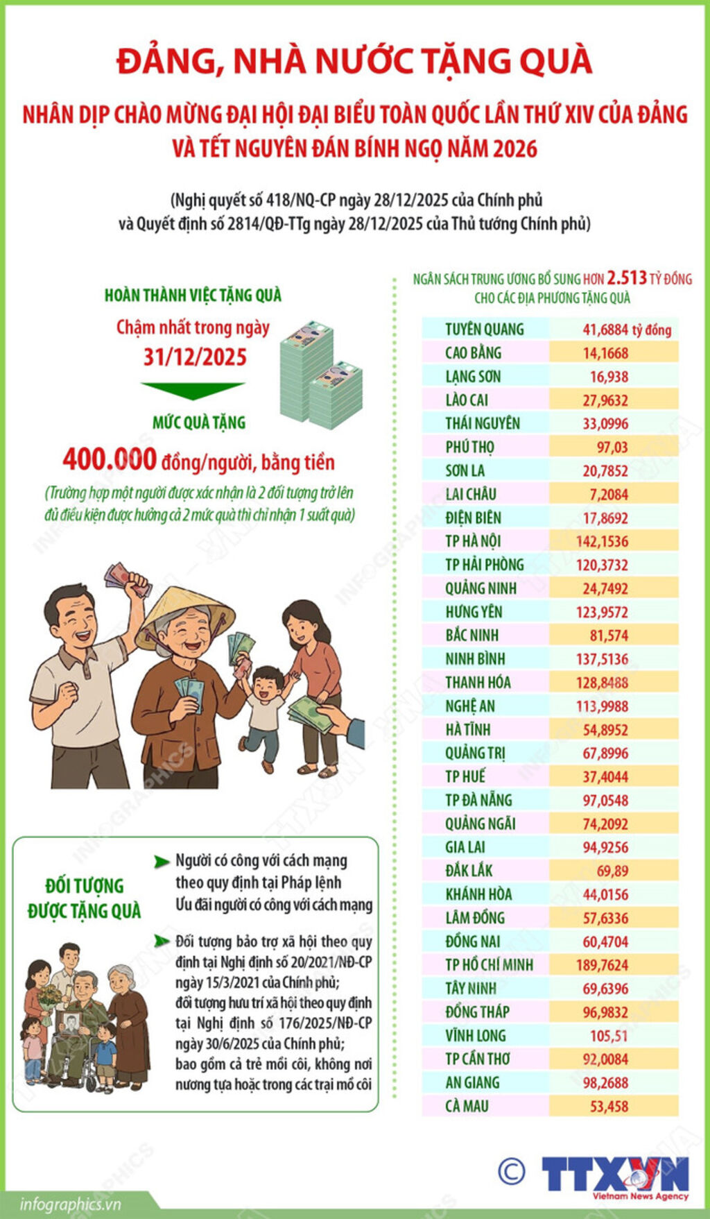 Ngoài thực hiện Nghị quyết số 418/NQ-CP, theo kế hoạch, tỉnh Lạng Sơn sẽ tổ chức hoạt động thăm, tặng quà, chúc Tết Nguyên đán Bính Ngọ năm 2026 hướng đến các đối tượng người có công, gia đình chính sách, hộ nghèo, đối tượng bảo trợ xã hội... trên địa bàn. Mỗi suất quà trị giá 600.000 đồng bằng tiền mặt, kinh phí được trích từ nguồn đảm bảo xã hội giao cho các xã, phường thực hiện. Việc tổ chức các hoạt động bảo đảm thiết thực, ý nghĩa để mọi nhà, mọi người đều được đón Tết vui tươi, phấn khởi, đầm ấm./.