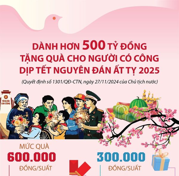 • Dành hơn 500 tỷ đồng tặng quà cho người có công dịp Tết Nguyên đán Ất Tỵ 2025