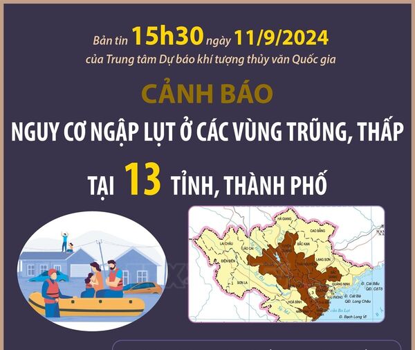 • Cảnh báo nguy cơ ngập lụt ở các vùng trũng, thấp tại 13 tỉnh, thành phố (cập nhật lúc 15h30 ngày 11/9/2024)