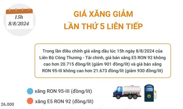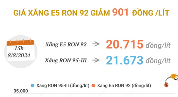 • Giá xăng E5 RON 92 giảm 901 đồng/lít