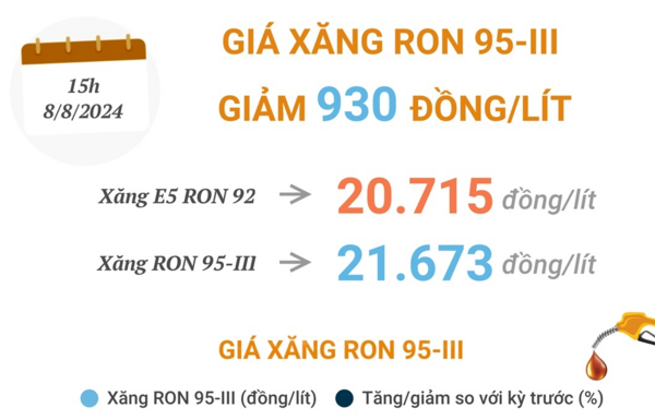 • Giá xăng RON 95-III giảm 930 đồng/lít