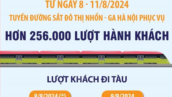 • Từ ngày 8 - 11/8/2024: Tuyến đường sắt đô thị Nhổn - ga Hà Nội phục vụ hơn 256.000 lượt hành khách