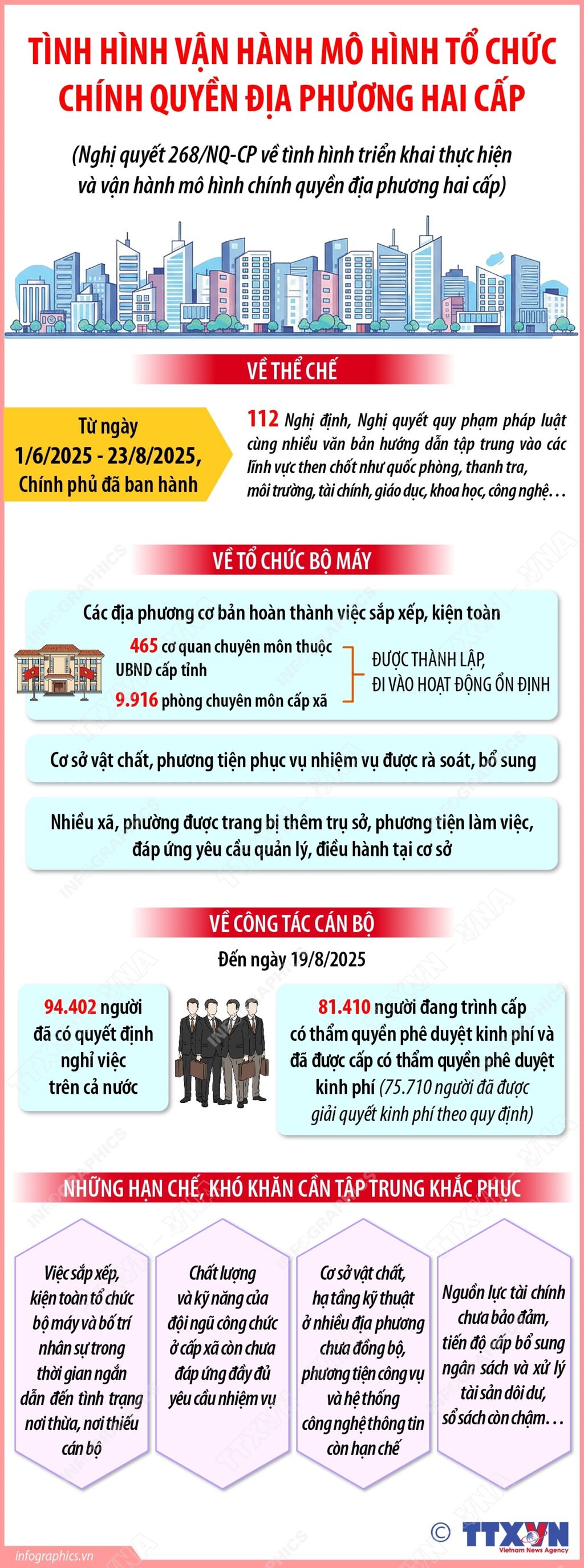 Việc triển khai mô hình chính quyền địa phương hai cấp đã được Bộ Chính trị, Tổng Bí thư, Chính phủ, Thủ tướng Chính phủ lãnh đạo, chỉ đạo quyết liệt và các bộ, ngành, địa phương nghiêm túc thực hiện, đạt nhiều kết quả quan trọng, tạo bước chuyển rõ nét trong tổ chức và vận hành bộ máy hành chính nhà nước.