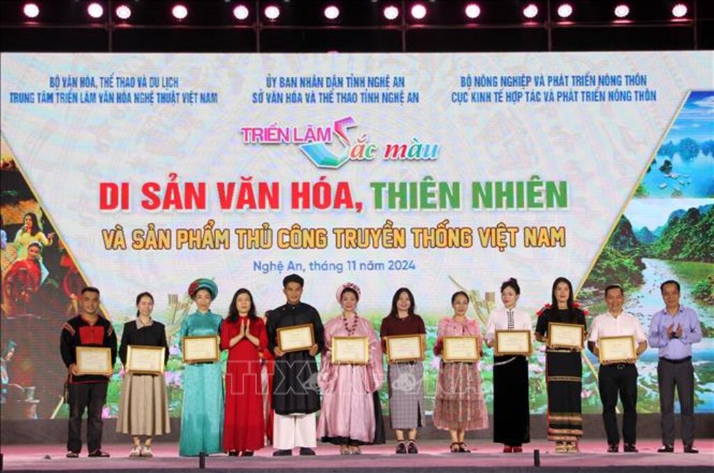 Ban Tổ chức đã trao các Bằng khen của Bộ Văn hóa, Thể thao và Du lịch, UBND tỉnh Nghệ An cho các tổ chức, cá nhân có thành tích xuất sắc trong tham gia Triển lãm; trao 1 giải Đặc biệt, 17 giải A, 10 giải B, 5 giải C cho các tiết mục xuất sắc tham gia Liên hoan nghệ thuật dân gian truyền thống “Việt Nam - Những sắc màu di sản”./.