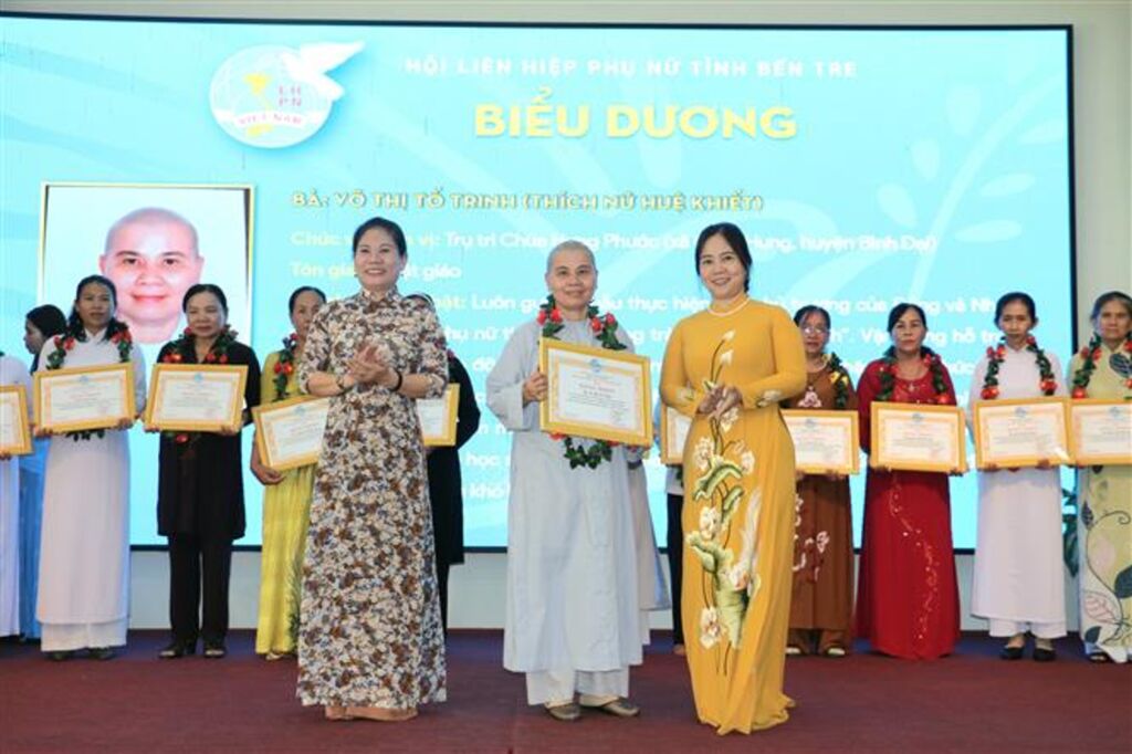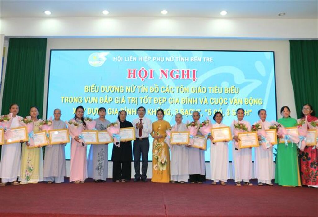 Dịp này, Hội Liên hiệp Phụ nữ tỉnh đã tặng Bằng khen cho 17 tập thể, 53 cá nhân là các nữ tín đồ tôn giáo tiêu biểu đã có thành tích xuất sắc trong nỗ lực phấn đấu vì cộng đồng. Ngoài ra, Ban Tổ chức Hội thi tuyến đường xanh – sạch – sáng – an toàn đã trao giải cho 23 đơn vị xuất sắc, trong đó Hội liên hiệp Phụ nữ xã Tân Lợi Thạnh, huyện Giồng Trôm giành giải Nhất./.