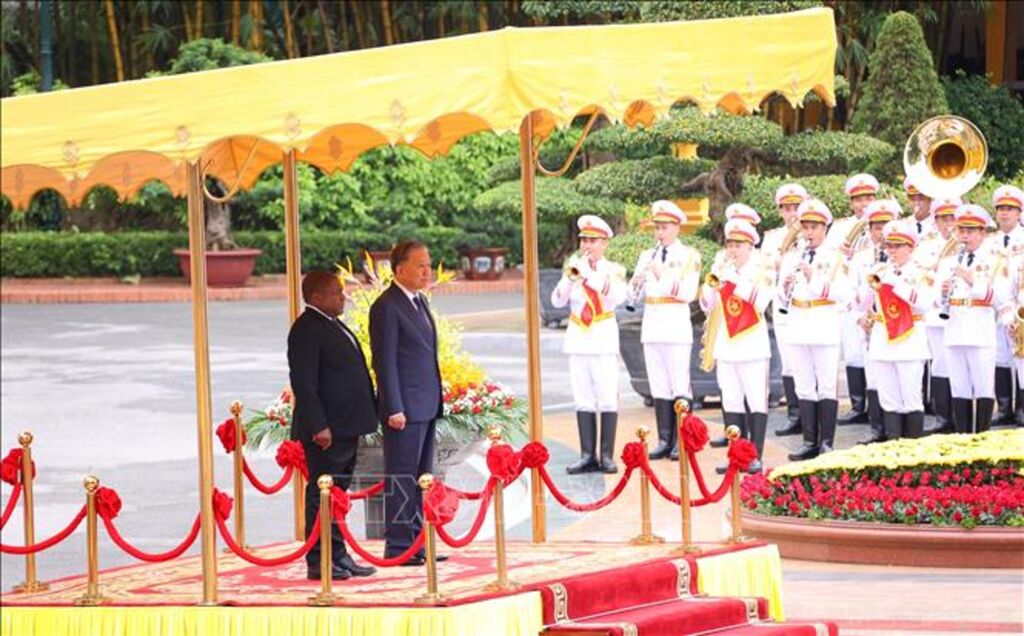 Đoàn xe hộ tống đưa Tổng thống Filipe Jacinto Nyusi và Phu nhân tiến vào Phủ Chủ tịch, Tổng Bí thư, Chủ tịch nước Tô Lâm và Phu nhân nồng nhiệt chào đón Tổng thống Filipe Jacinto Nyusi dẫn đầu Đoàn cấp cao Mozambique thăm chính thức Việt Nam.