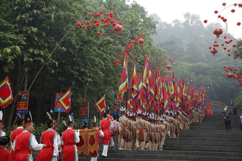 Trong không khí trang nghiêm, Tổng Bí thư, Chủ tịch nước Tô Lâm cùng đoàn đại biểu lãnh đạo Ðảng, Nhà nước, các cơ quan Trung ương, địa phương đã tề tựu đông đủ trước sân hành lễ tại khu vực Trung tâm Lễ hội Đền Hùng. Trong tiếng nhạc lễ hội linh thiêng, đoàn dâng hương với đội nghi trượng uy nghiêm, đoàn cờ phướn lộng lẫy, đội rước kiệu và lễ vật khởi hành từ sân Trung tâm Lễ hội qua Nghi môn, đền Hạ, đền Trung lên đền Thượng.