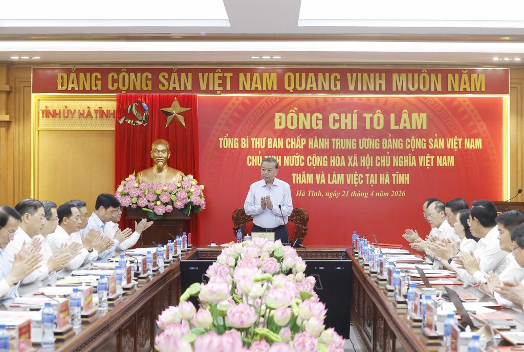 Chiều 21/4, tại Hà Tĩnh, Tổng Bí thư, Chủ tịch nước Tô Lâm và Đoàn công tác Trung ương đã làm việc với Ban Thường vụ Tỉnh ủy Hà Tĩnh về tình hình, kết quả triển khai thực hiện Nghị quyết Đại hội XIV của Đảng, Đại hội XX của Đảng bộ tỉnh; các chủ trương, nghị quyết chiến lược của Trung ương và định hướng nhiệm vụ chiến lược phát triển tỉnh Hà Tĩnh trong thời gian tới.