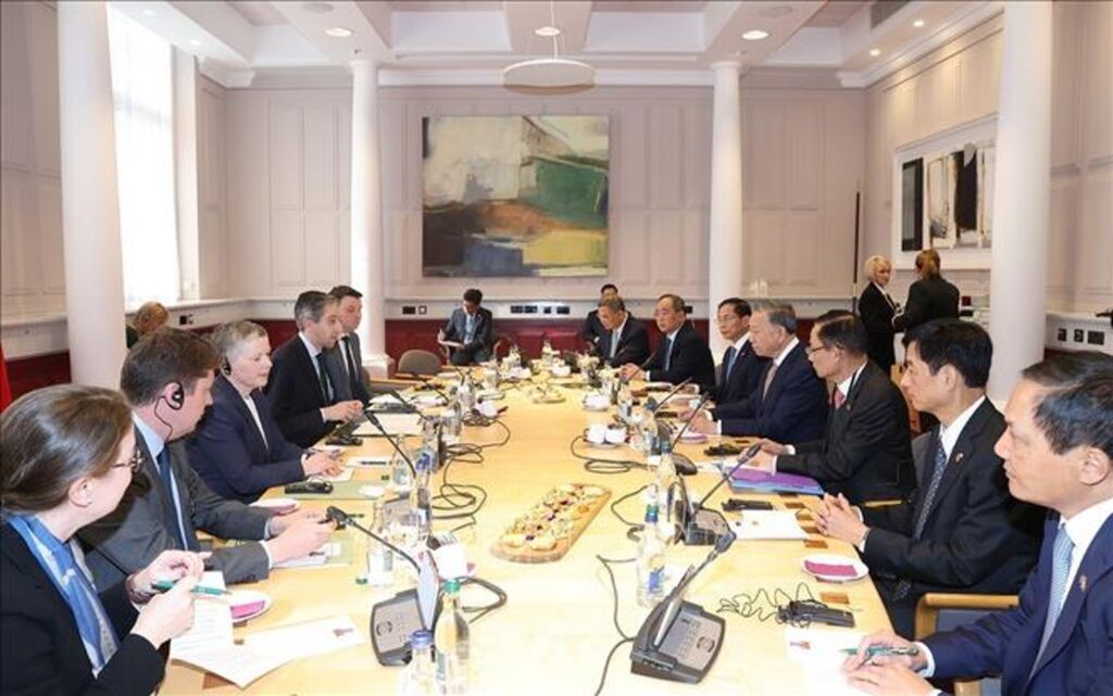 Tổng Bí thư, Chủ tịch nước Tô Lâm cảm ơn sự đón tiếp trọng thị và chu đáo mà Nhà nước, Chính phủ và nhân dân Ireland dành cho đoàn, khẳng định Việt Nam luôn coi trọng và mong muốn tăng cường quan hệ hữu nghị, hợp tác nhiều mặt với Ireland.