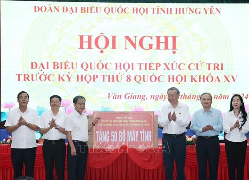 Nhân dịp này, Tổng Bí thư, Chủ tịch nước Tô Lâm đã trao tặng 50 bộ máy tính cho huyện Văn Giang, tỉnh Hưng Yên và đến thăm, tặng quà gia đình thương binh Nguyễn Văn Thân, sinh năm 1949, ở thôn Như Phượng Thượng, xã Long Hưng và gia đình bà Đinh Thị Ngân, sinh năm 1962, là hộ thoát nghèo, ở thôn Như Lân, xã Long Hưng./.
