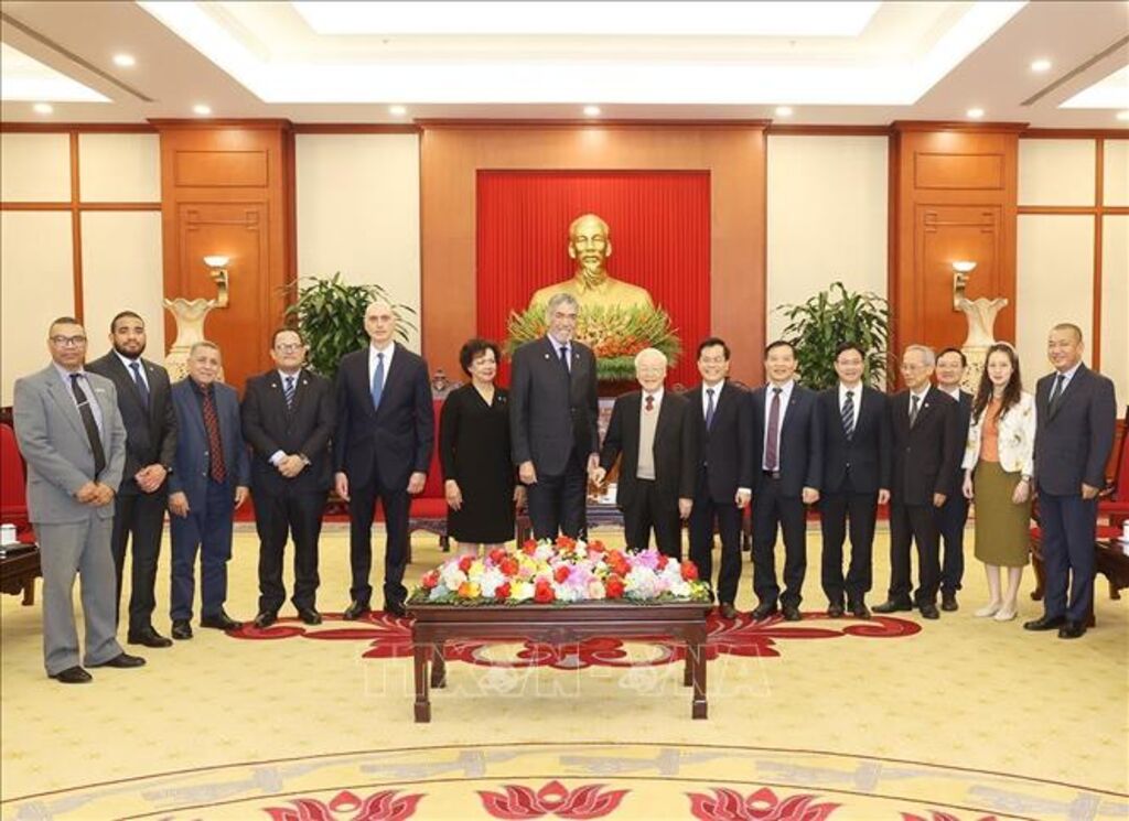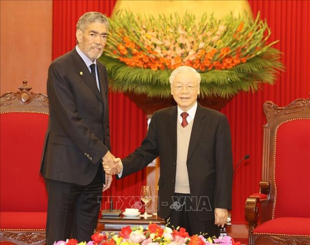 TTXVN - Chiều 21/2, tại Trụ sở Trung ương Đảng, Tổng Bí thư Nguyễn Phú Trọng đã tiếp Đoàn đại biểu cấp cao Đảng Phong trào Cánh tả Thống nhất (MIU), do Tổng Bí thư Miguel Mejia (Mi-ghen Mê-hi-a), Bộ trưởng Chính sách hội nhập khu vực Cộng hòa Dominicana (Đô-mi-ni-ca-na), dẫn đầu thăm và làm việc tại Việt Nam, từ ngày 18/2 đến ngày 26/2/2023.