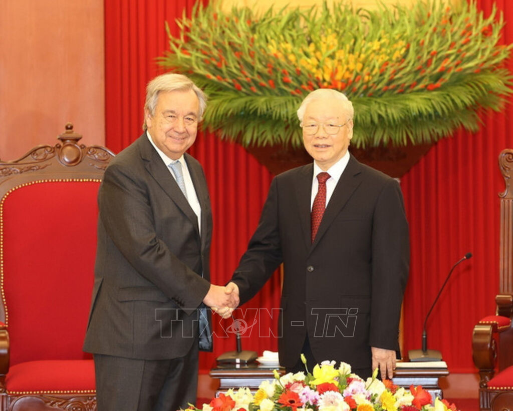 Tổng Bí thư Nguyễn Phú Trọng đã đánh giá cao chuyến thăm của ngài Tổng Thư ký António Guterres, đặc biệt đúng vào dịp kỷ niệm 45 năm Việt Nam trở thành thành viên chính thức của Liên hợp quốc, có ý nghĩa rất quan trọng đối với quan hệ giữa Việt Nam và Liên hợp quốc hiện đang phát triển tốt đẹp.