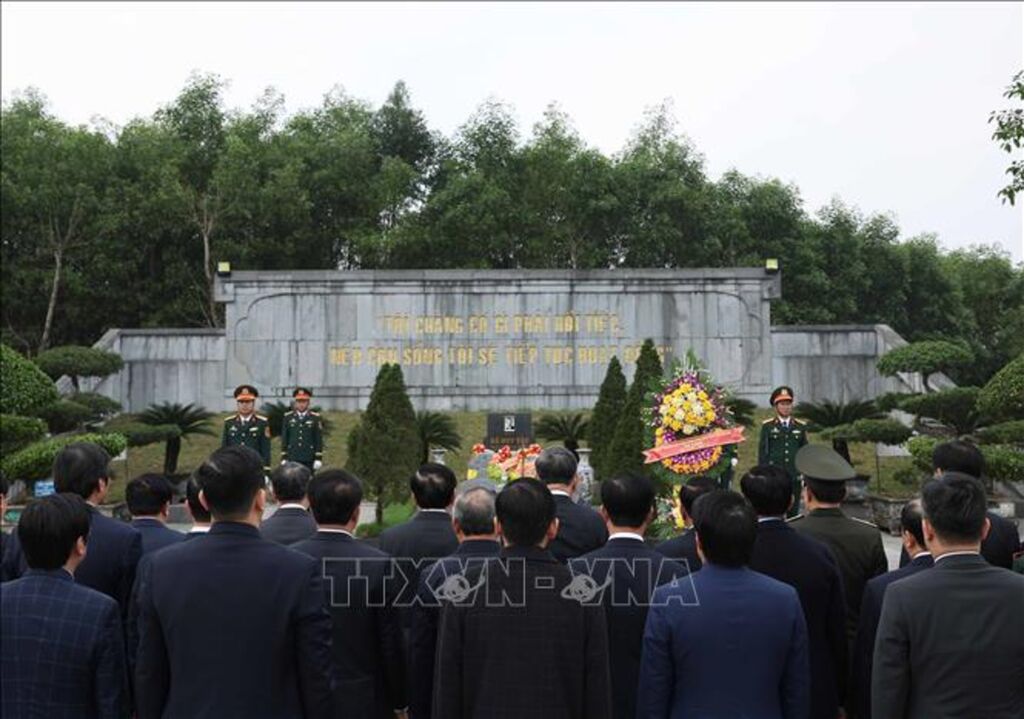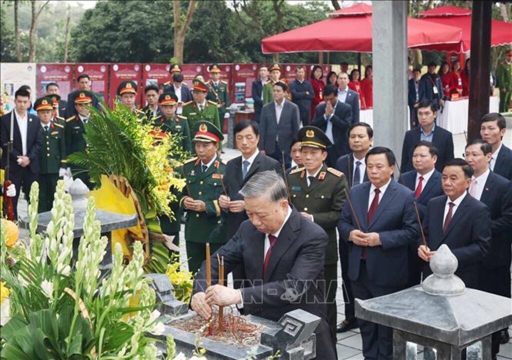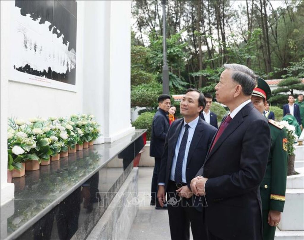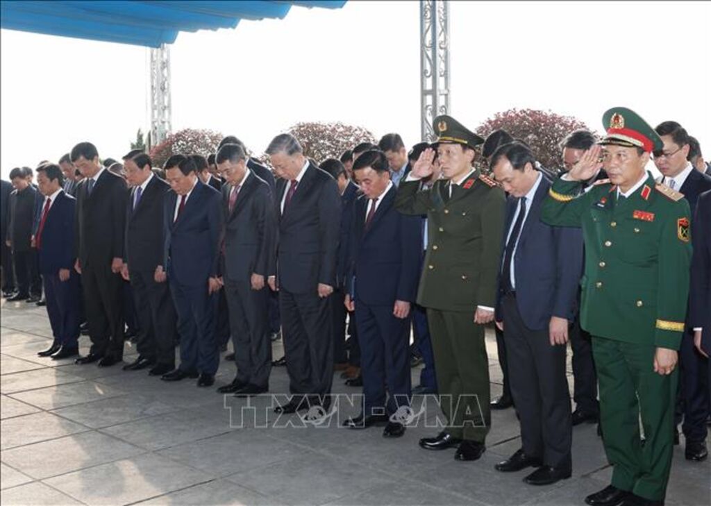 Trước anh linh các anh hùng liệt sỹ, Tổng Bí thư Tô Lâm và Đoàn công tác kính cẩn nghiêng mình, bày tỏ lòng biết ơn vô hạn đối với công lao to lớn của các thế hệ cha anh vì sự nghiệp đấu tranh giải phóng dân tộc và thống nhất đất nước.