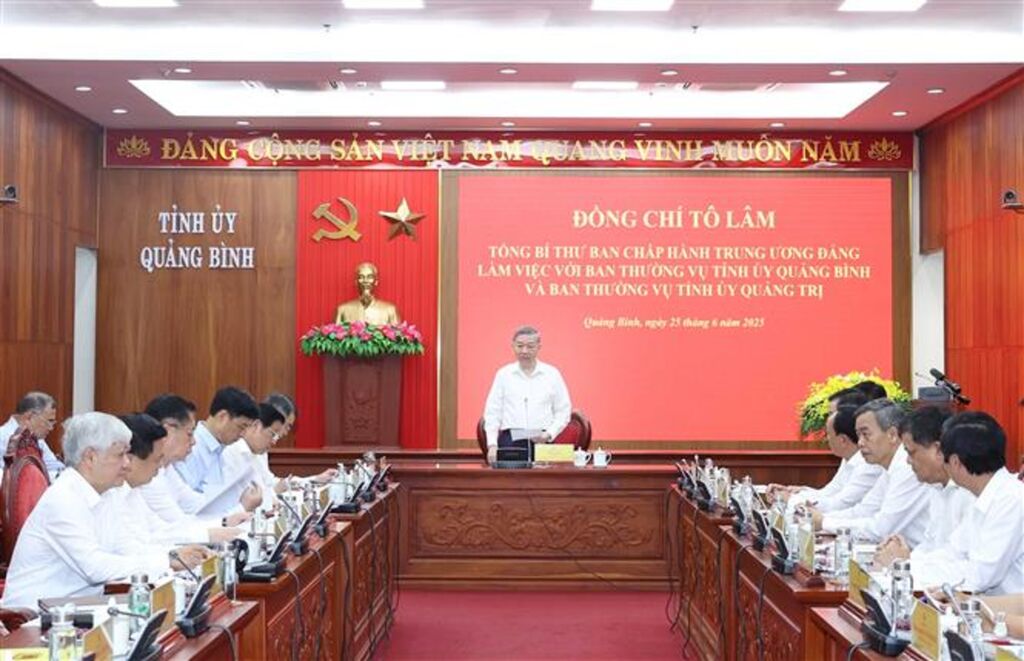 Sáng 25/6, tại Quảng Bình, Tổng Bí thư Tô Lâm và Đoàn công tác của Trung ương đã làm việc với Ban Thường vụ Tỉnh ủy Quảng Bình và Ban Thường vụ Tỉnh ủy Quảng Trị về kết quả triển khai thực hiện các nghị quyết, kết luận của Trung ương và một số nhiệm vụ trọng tâm phát triển kinh tế - xã hội, đảm bảo quốc phòng, an ninh trên địa bàn tỉnh Quảng Bình, Quảng Trị.