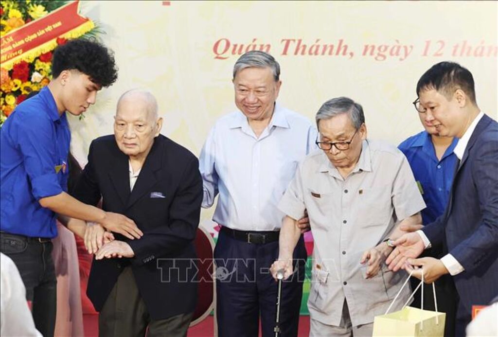 Nhân dịp này, Tổng Bí thư Tô Lâm trao quà cho 17 đồng chí đảng viên có từ 70 năm tuổi Đảng trở lên đang sinh hoạt tại Đảng bộ phường Quán Thánh. Chủ tịch Quốc hội Trần Thanh Mẫn tặng quà cho tập thể phường Quán Thánh và trao 22 suất quà chúc mừng các cặp đôi ông bà chung sống hạnh phúc trên 50 năm, là gia đình văn hóa tiêu biểu trên địa bàn. Thường trực Ban Bí thư, Chủ nhiệm Ủy ban Kiểm tra Trung ương Trần Cẩm Tú và Phó Thủ tướng Thường trực Chính phủ Nguyễn Hòa Bình trao quà cho 8 địa bàn dân cư phường Quán Thánh. Bí thư Thành ủy Hà Nội Bùi Thị Minh Hoài tặng quà chung cho tập thể phường Quán Thánh và đại diện gia đình tiêu biểu của phường Quán Thánh; quận Ba Đình cũng dành tặng 5 suất quà cho các hộ gia đình tiêu biểu trên địa bàn phường./.