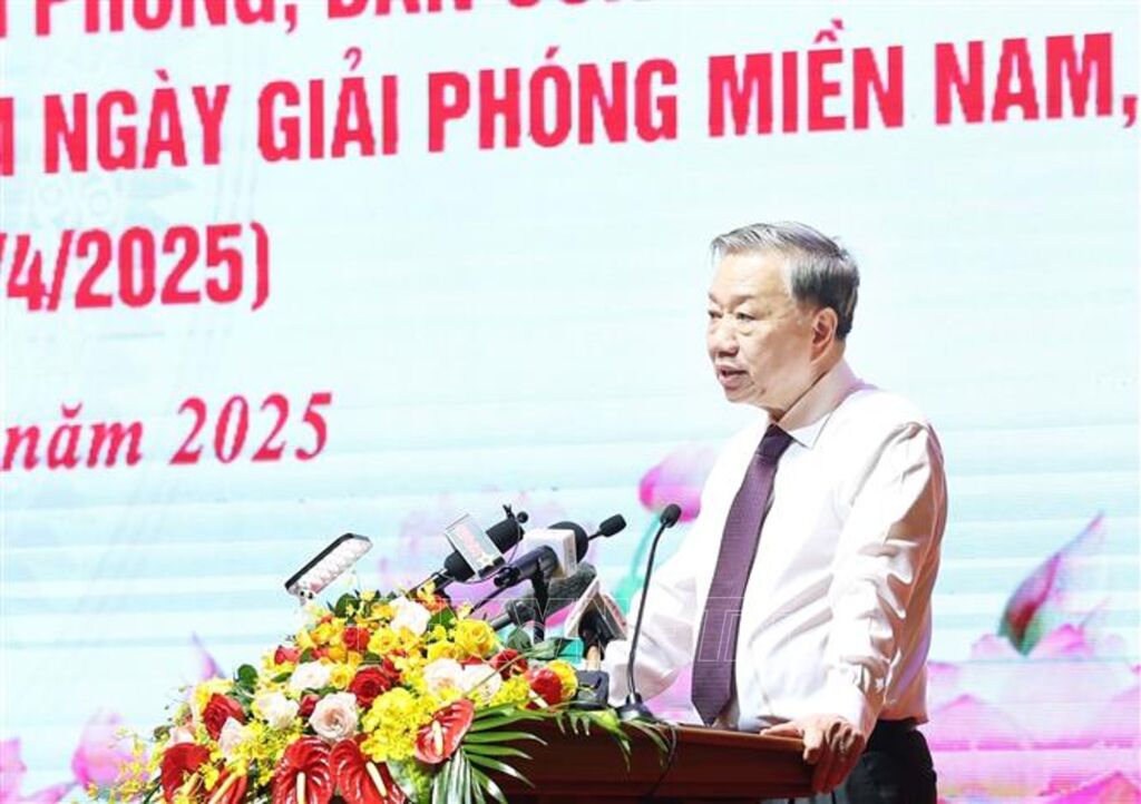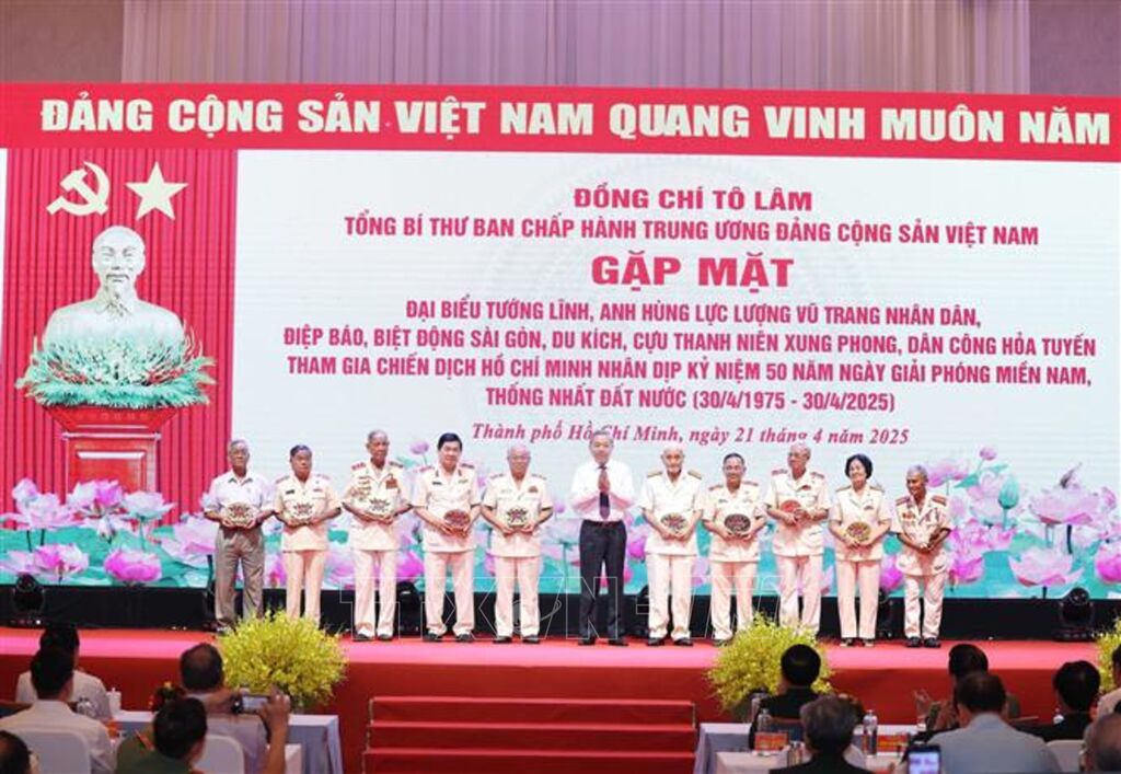 Nhân dịp kỷ niệm 50 năm Ngày giải phóng miền Nam, thống nhất đất nước (30/4/1975- 30/4/2025), tiếp tục các hoạt động tại Thành phố Hồ Chí Minh, chiều 21/4, Tổng Bí thư Tô Lâm, Bí thư Quân ủy Trung ương đã gặp mặt đại biểu tướng lĩnh, Anh hùng Lực lượng vũ trang nhân dân, điệp báo, biệt động Sài Gòn, du kích, cựu thanh niên xung phong, dân công hỏa tuyến tham gia Chiến dịch Hồ Chí Minh.