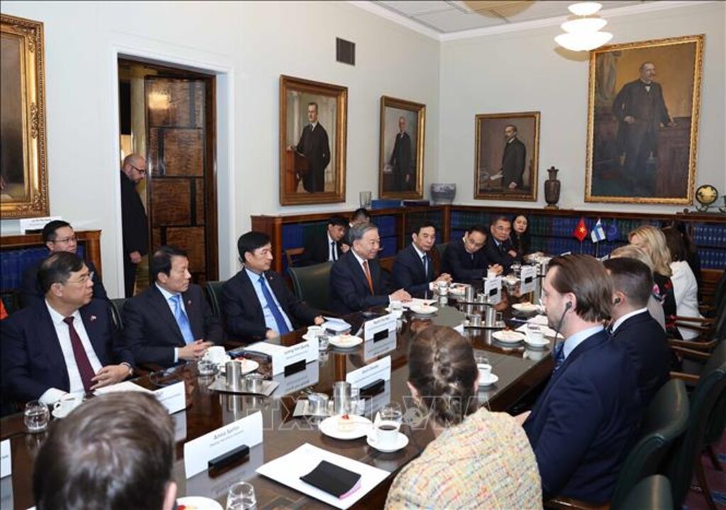 Theo đặc phái viên TTXVN, sáng 22/10 (giờ địa phương), tại trụ sở Quốc hội Phần Lan, thủ đô Helsinki, Tổng Bí thư Tô Lâm đã hội kiến với Phó Chủ tịch thứ nhất Quốc hội Phần Lan Paula Risikko.