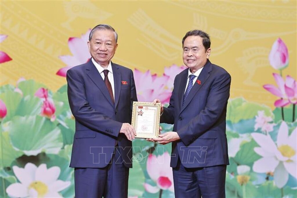 Chủ tịch Quốc hội Trần Thanh Mẫn trân trọng trao Kỷ niệm chương của Ủy ban Thường vụ Quốc hội tặng Tổng Bí thư Tô Lâm.