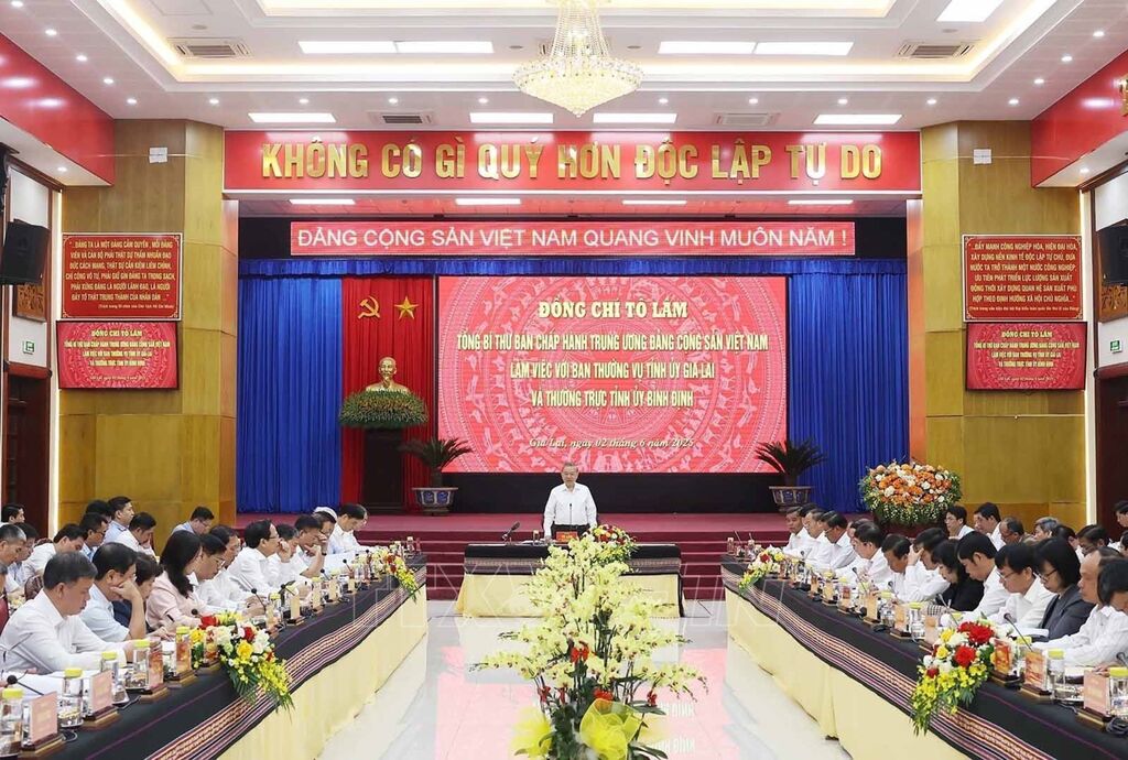 Phát biểu kết luận tại buổi làm việc, Tổng Bí thư Tô Lâm nhấn mạnh, cuộc làm việc Ban Thường vụ Tỉnh ủy Gia Lai và Thường trực Tỉnh ủy Bình Định là sự tiếp nối những chỉ đạo xuyên suốt để mở ra một giai đoạn phát triển mới cho cả hai địa phương, đặc biệt trong bối cảnh chuẩn bị hợp nhất hai tỉnh Gia Lai và Bình Định thành một đơn vị hành chính - kinh tế mạnh, hiện đại và hiệu quả hơn.