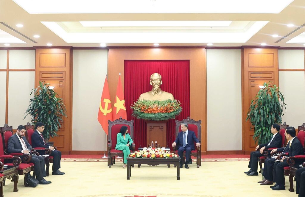 Tổng Bí thư Tô Lâm hoan nghênh chuyến thăm của đồng chí Delcy Rodriguez Gomez trong dịp kỷ niệm 35 năm thiết lập quan hệ ngoại giao giữa hai nước; đánh giá cao kết quả trao đổi, hội đàm giữa đồng chí Delcy Rodriguez Gomez với Chủ tịch nước Lương Cường và Phó Chủ tịch nước Nguyễn Thị Ánh Xuân, bày tỏ tin tưởng chuyến thăm sẽ góp phần quan trọng vào việc củng cố và tăng cường hơn nữa mối quan hệ truyền thống tốt đẹp giữa hai đảng, hai nước.