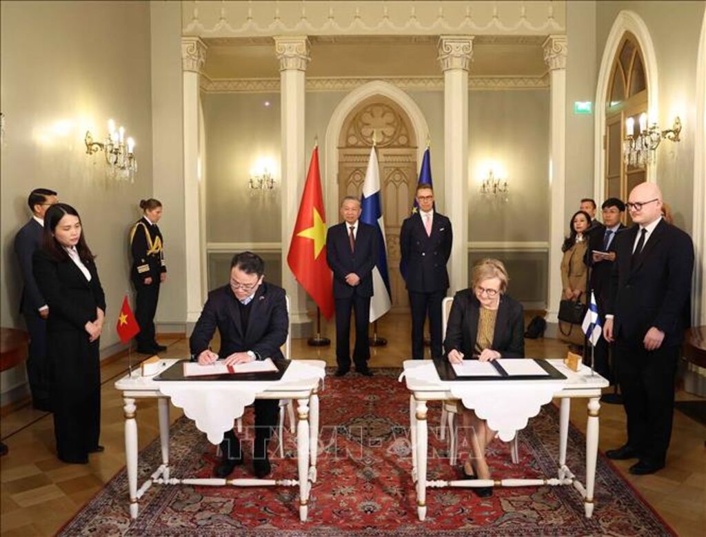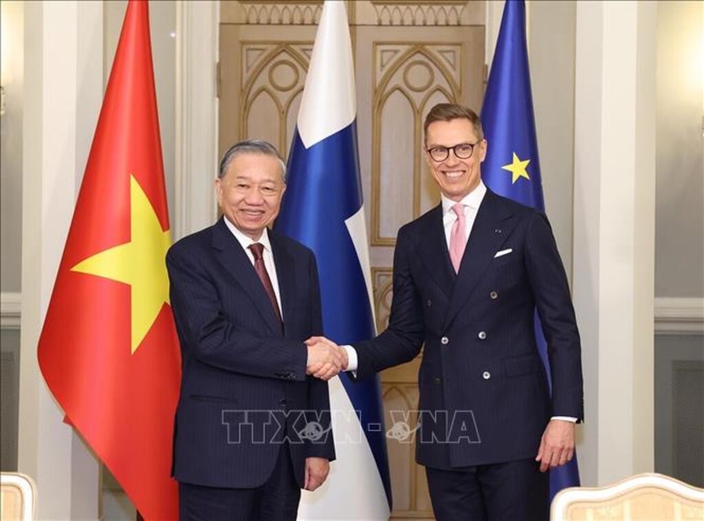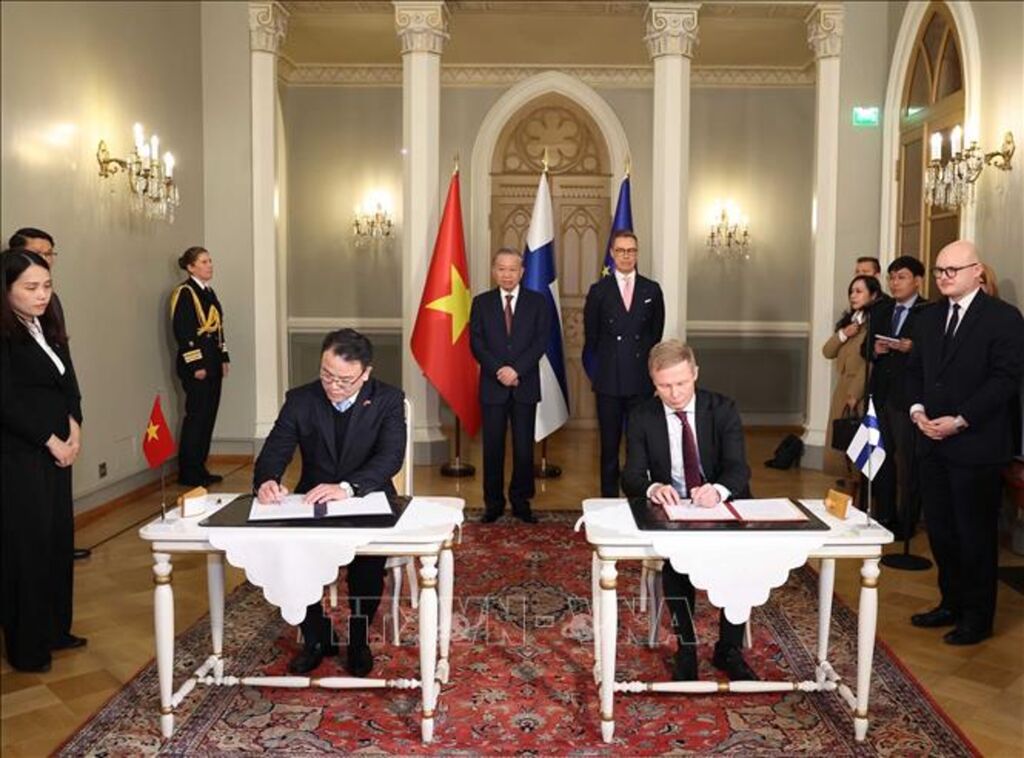 Theo đặc phái viên TTXVN, trong khuôn khổ chuyến thăm chính thức của Tổng Bí thư Tô Lâm và Phu nhân cùng Đoàn đại biểu cấp cao Việt Nam tới Cộng hòa Phần Lan, trưa 21/10 (theo giờ địa phương), tại Phủ Tổng thống, Tổng Bí thư Tô Lâm và Tổng thống Cộng hòa Phần Lan Alexander Stubb đã chứng kiến Lễ ký kết các văn kiện hợp tác song phương Việt Nam - Phần Lan.