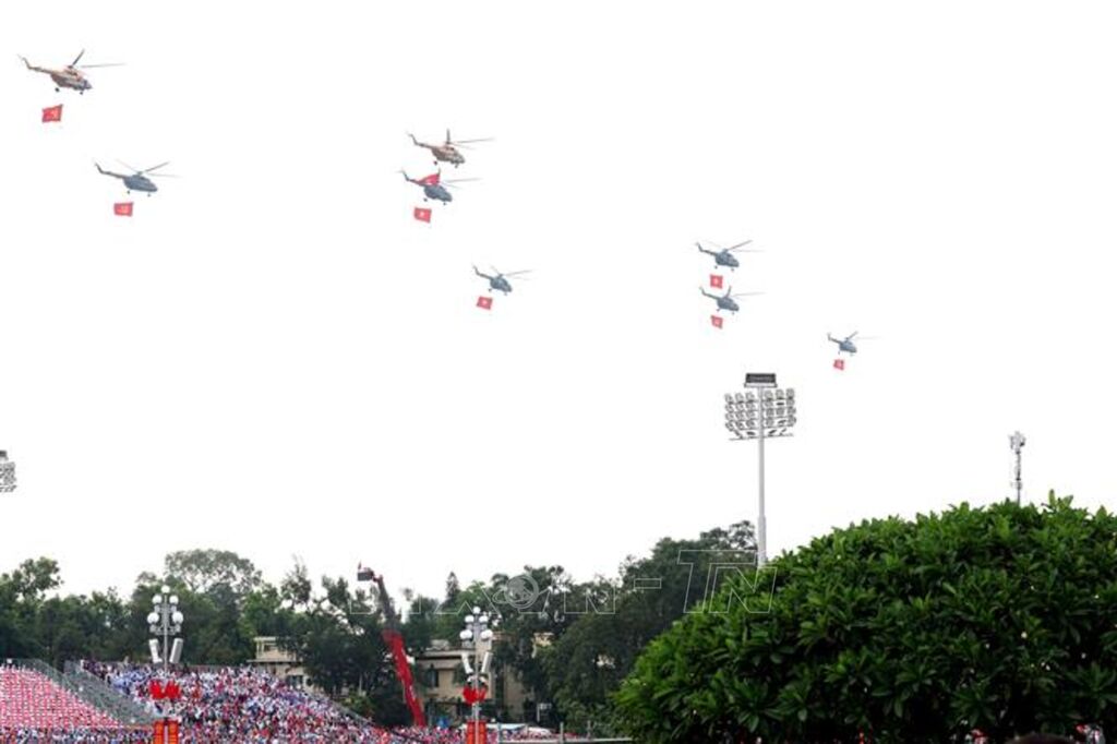 Mở đầu tổng duyệt diễu binh, diễu hành là các Biên đội của Không quân nhân dân Việt Nam anh hùng bay trên bầu trời Tổ quốc. Dẫn đầu là biên đội trực thăng Mi-171, Mi-17, Mi-8, mang theo cờ Đảng, cờ Tổ quốc tung bay trên Quảng trường Ba Đình lịch sử, biểu tượng cho sức mạnh đại đoàn kết, niềm tự hào của Đảng và dân tộc, thể hiện bản lĩnh, trí tuệ, khát vọng xây dựng đất nước cất cánh, vươn cao trong kỷ nguyên mới. Tiếp đó, đội hình máy bay vận tải Casa C-295 và C212i - những “chiến binh thầm lặng”, đảm nhiệm hiệp đồng chiến đấu, trinh sát, vận chuyển, tìm kiếm cứu nạn. Góp mặt trong khối bay chào mừng còn có Yak-130, L-39NG và Su-30MK2.
