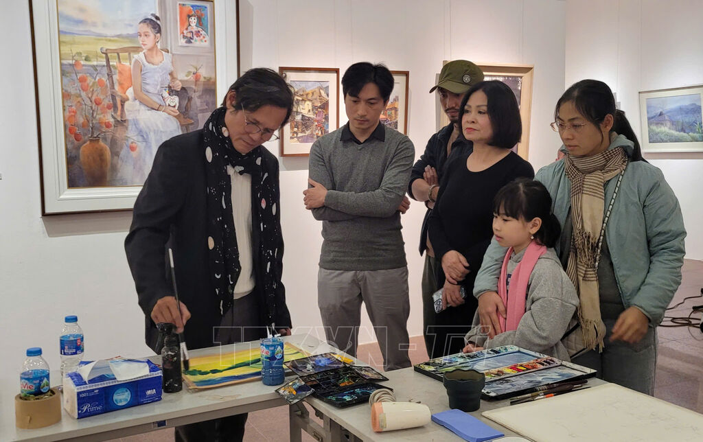 Diễn ra từ ngày 24/1 - 1/2 tại Art Space (42 Yết Kiêu, Hà Nội), triển lãm “Chuyện màu nước” là cuộc hội ngộ của 9 họa sĩ thuộc Nhóm Vietnam Watercolor Artists, gồm: Bùi Duy Khánh, Đinh Quang Hải, Đinh Minh Thiện, Nguyễn Phương Bắc, Dương Tôn Quốc Thụy, Chu Quốc Bình, Nguyễn Thu Hà, Bảo Huỳnh và Hoàng Quốc Đạt. 100 tác phẩm được giới thiệu tại triển lãm với đề tài phong phú: phong cảnh, phố thị, tĩnh vật, thuyền và biển, chân dung… thể hiện qua nhiều phong cách khác nhau như hiện thực, biểu hiện, trừu tượng và siêu thực. Ở đó, người xem có thể bắt gặp những lớp màu trong trẻo, những khoảng loang đầy ngẫu hứng hay những đối thoại nội tâm sâu sắc.