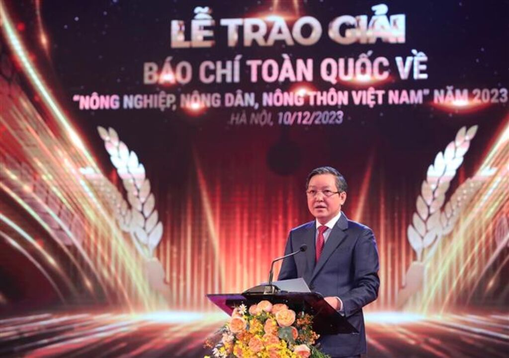TTXVN - Tối 10/12, tại Hà Nội, Trung ương Hội Nông dân Việt Nam chủ trì cùng Ban Tuyên giáo Trung ương, Hội Nhà báo Việt Nam tổ chức Lễ trao Giải Báo chí toàn quốc về nông nghiệp, nông dân, nông thôn Việt Nam năm 2023. Bí thư Trung ương Đảng, Trưởng Ban Dân vận Trung ương Bùi Thị Minh Hoài dự Lễ.