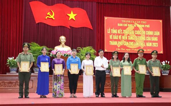 TTXVN - Tối 22/10, Lễ trao giải Cuộc thi Chính luận về bảo vệ nền tảng tư tưởng của Đảng lần thứ 3 năm 2023 diễn ra tại Hà Nội. Cuộc thi do Ban Chỉ đạo 35 Trung ương chỉ đạo, phân công Học viện Chính trị quốc gia Hồ Chí Minh chủ trì, phối hợp với Ban Tuyên giáo Trung ương, Hội đồng Lý luận Trung ương, Báo Nhân dân, Tạp chí Cộng sản, Đài Truyền hình Việt Nam và Hội Nhà báo Việt Nam tổ chức.