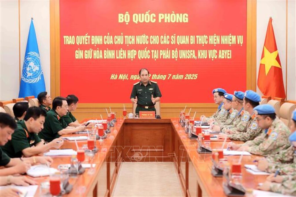 Chiều 22/7, tại Hà Nội, Bộ Quốc phòng tổ chức Lễ trao quyết định của Chủ tịch nước, Quyết định của Bộ trưởng Bộ Quốc phòng cho ba sĩ quan Quân đội nhân dân Việt Nam đi thực hiện nhiệm vụ gìn giữ hòa bình của Liên hợp quốc tại phái bộ UNISFA (khu vực Abyei).