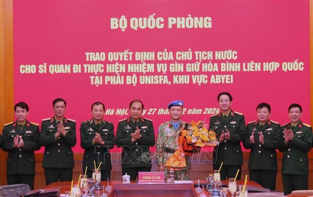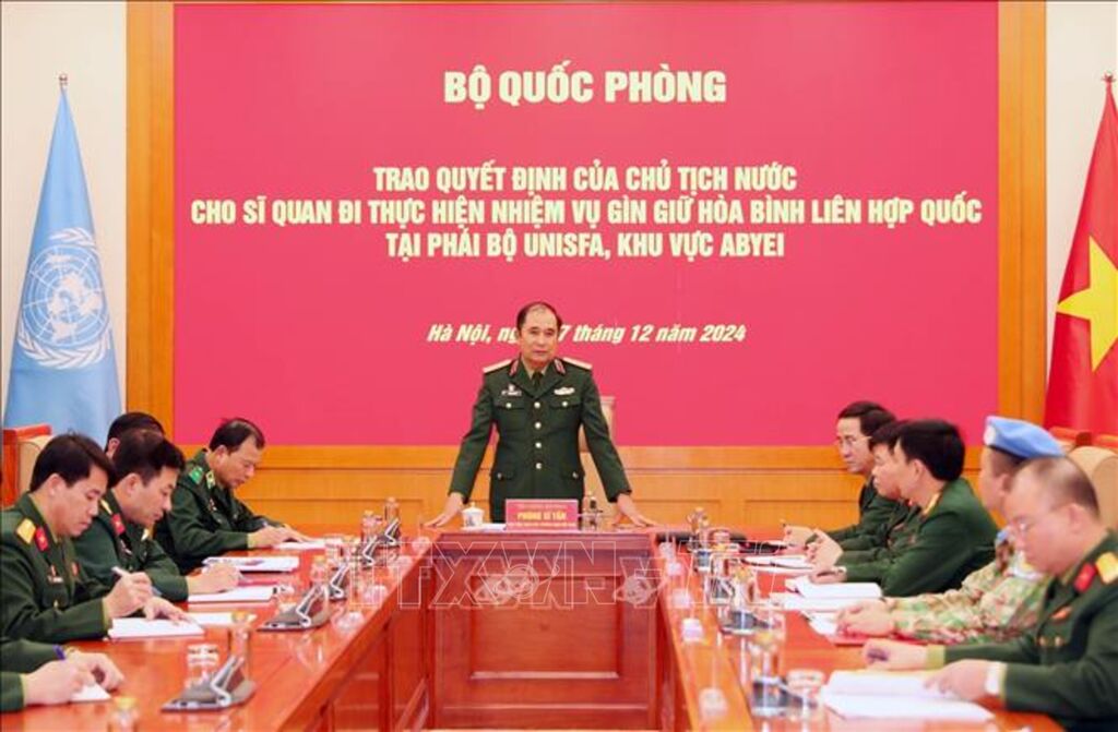 Chiều 27/12, tại Hà Nội, Bộ Quốc phòng tổ chức trao Quyết định của Chủ tịch nước cho sĩ quan đi thực hiện nhiệm vụ gìn giữ hòa bình Liên hợp quốc tại phái bộ An ninh lâm thời Liên hợp quốc tại khu vực Abyei (UNISFA).