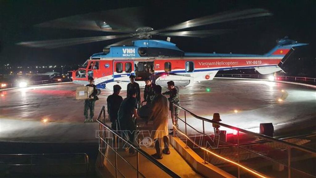 Thực hiện chỉ lệnh của cấp trên, đúng 18 giờ 5 phút ngày 29/1, tổ bay thuộc Công ty Trực thăng Miền Nam điều khiển trực thăng EC225 số hiệu VN-8619 đã cất cánh từ sân bay Vũng Tàu. Đây là dòng trực thăng hiện đại, có khả năng bay biển đêm và chịu được điều kiện thời tiết phức tạp. Trực thăng nhanh chóng bay đến sân bay Tân Sơn Nhất để đón tổ cấp cứu chuyên khoa của Bệnh viện Quân y 175 trước khi bay ra Trường Sa.