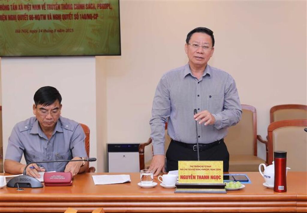 Sáng 14/8, tại Trụ sở Trung tâm Thông tấn quốc gia (số 5 Lý Thường Kiệt, Hà Nội), Đoàn công tác của Thường trực Hội đồng Phối hợp phổ biến, giáo dục pháp luật Trung ương do Thứ trưởng Bộ Tư pháp Nguyễn Thanh Ngọc, Phó Chủ tịch Hội đồng làm Trưởng đoàn đã làm việc với Thông tấn xã Việt Nam (TTXVN).