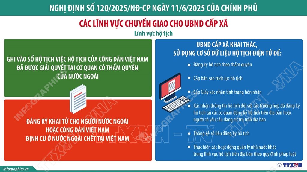 Theo Nghị định số 120/2025/NĐ-CP ngày 11/6/2025 quy định về phân định thẩm quyền của chính quyền địa phương 02 cấp trong lĩnh vực quản lý nhà nước của Bộ Tư pháp, từ 1/7/2025, lĩnh vực hộ tịch (đăng ký khai sinh; đăng ký kết hôn; đăng ký giám hộ, chấm dứt giám hộ giữa công dân Việt Nam và người nước ngoài cùng cư trú tại Việt Nam; Đăng ký nhận cha, mẹ, con…) được chuyển giao cho UBND cấp xã.
