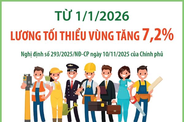 • Từ 1/1/2026: Lương tối thiểu vùng tăng 7,2%
