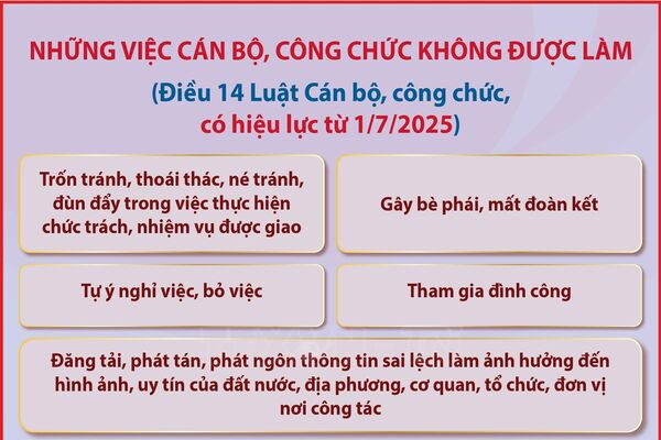 11/07/2025 10:46’ Điều 14 Luật Cán bộ, công chức quy định những việc cán bộ công chức không được làm như: Trốn tránh, thoái thác, né tránh, đùn đẩy trong việc thực hiện chức trách, nhiệm vụ được giao; gây bè phái, mất đoàn kết...