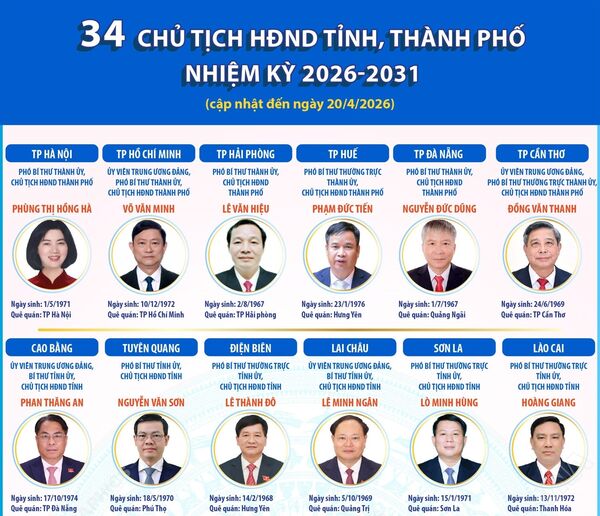 Thông tin về 34 Chủ tịch HĐND tỉnh, thành phố nhiệm kỳ 2026-2031