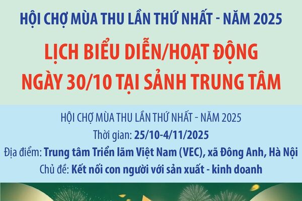 • Hội chợ Mùa thu lần thứ nhất - năm 2025: Lịch biểu diễn/hoạt động ngày 30/10 tại Sảnh Trung tâm