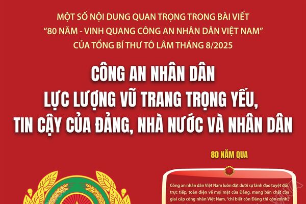 Tám mươi năm, một chặng đường đủ dài để khẳng định bản lĩnh, trí tuệ, sự trưởng thành vượt bậc của lực lượng Công an nhân dân dưới sự lãnh đạo tuyệt đối, toàn diện, trực tiếp của Đảng; sự quản lý thống nhất của Nhà nước; sự đùm bọc, chở che, giúp đỡ của Nhân dân. -