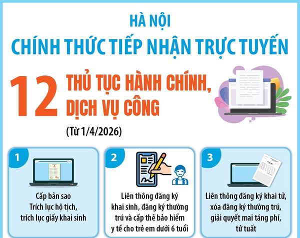 • Hà Nội: Chính thức tiếp nhận trực tuyến 12 thủ tục hành chính, dịch vụ công từ 1/4/2026