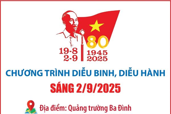 14/07/2025 09:05’ Chương trình sẽ bắt đầu vào lúc 6h30 với hoạt động rước đuốc truyền thống; tiếp đến là Nghi lễ Chào cờ; Tuyên bố lý do, giới thiệu đại biểu; Diễn văn của lãnh đạo Đảng, Nhà nước và Chương trình diễu binh, diễu hành…