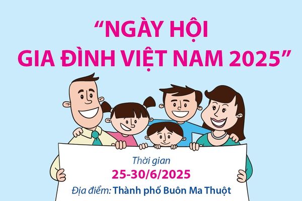17/06/2025 20:43’ Ngày hội Gia đình Việt Nam năm 2025 sẽ diễn ra từ ngày 25 - 30/6 tại thành phố Buôn Ma Thuột (tỉnh Đắk Lắk), với chủ đề "Gia đình hạnh phúc - Quốc gia thịnh vượng".