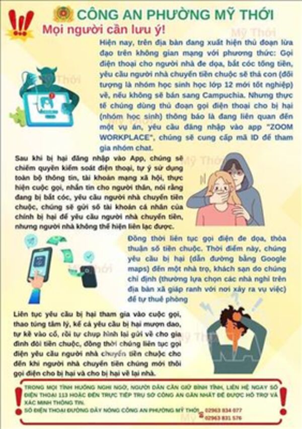 Công an tỉnh An Giang vừa có thông báo gửi lãnh đạo Công an 102 xã, phường, đặc khu trong tỉnh, cảnh báo về phương thức, thủ đoạn mới của nhóm lừa đảo dựng chuyện bắt cóc trẻ em, học sinh, ép gia đình nạn nhân chuyển tiền. -