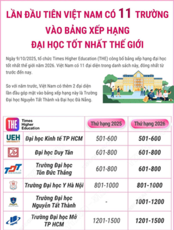 Tổ chức Times Higher Education (THE) tháng 10/2025 công bố bảng xếp hạng đại học tốt nhất thế giới năm 2026. Việt Nam có 11 đại diện trong danh sách này, đông nhất từ trước đến nay. So với năm trước, Việt Nam có thêm 2 đại diện lần đầu góp mặt vào bảng xếp hạng này là Trường Đại học Nguyễn Tất Thành và Đại học Đà Nẵng. -