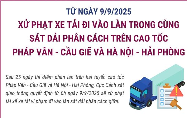 10/09/2025 18:23’ Sau 25 ngày thí điểm phân làn trên hai tuyến cao tốc Pháp Vân - Cầu Giẽ và Hà Nội - Hải Phòng, Cục Cảnh sát giao thông quyết định từ 0 giờ ngày 9/9/2025 sẽ xử phạt tài xế xe tải vi phạm đi vào làn sát dải phân cách giữa.