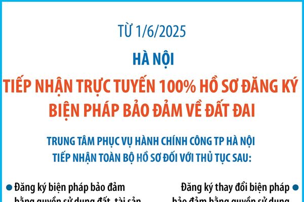Từ 1/6/2025: Hà Nội tiếp nhận 100% hồ sơ đăng ký biện pháp bảo đảm về đất đai trực tuyến