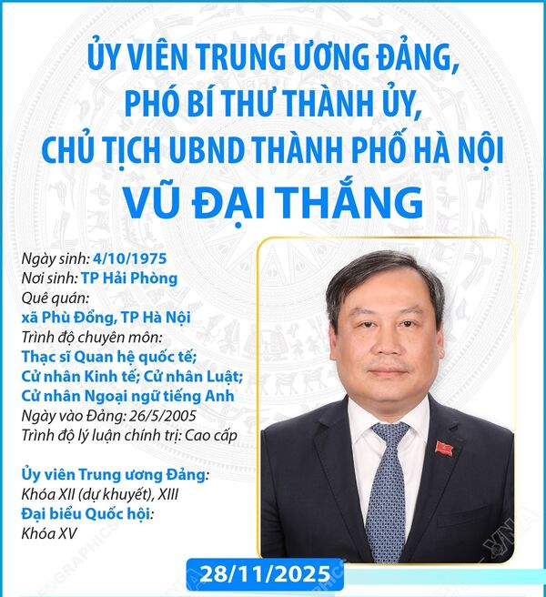 29/11/2025 12:19’ HĐND thành phố Hà Nội khóa XVI, nhiệm kỳ 2021-2026 đã bầu đồng chí Vũ Đại Thắng, Ủy viên Trung ương Đảng, Phó Bí thư Thành ủy giữ chức Chủ tịch UBND thành phố Hà Nội nhiệm kỳ 2021-2026.